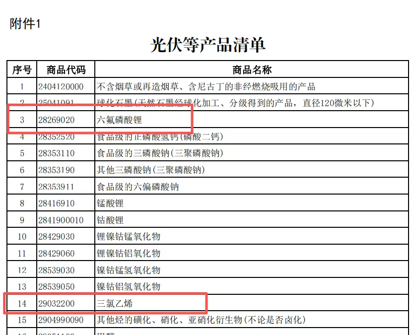 文件中涉及六氟磷酸锂、三氯乙烯等氟化工相关产业链产品,并且针对该门类产品的出口退税进行取消,具体产品包括如下: