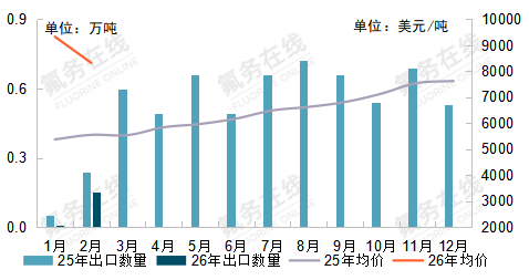 2026年1-2月,我国萤石(≤97%含量)总出口量2.9万吨,同比维稳;萤石(>97%含量)总出口量4.31万吨,出口同比↑555%。进口量同比继续上调,海关统计合计进口量33.86万吨,进口同比↑7.0%。单从2月份国别数据来看,萤石(>97%含量)进口主要来源于蒙古和赞比亚,2025 年以来,赞比亚每月进口萤石数量均保持相对稳定。其中,自蒙古进口总量达31.67万吨,占总进口量的89%。 图1:2025-2026年萤石出口走势图 原料方面 2026年1-2月,我国氟化氢总出口4.04万吨,同比↑2%;氟化铝总出口2.59万吨,同比↑37%。进口数量较少,主要以出口为主。单独从2月数据来看,氟化氢出口环比↓23.6%,氟化铝出口环比↑68.7%。 图2:2025-2026年氟化铝出口走势图 图3:2025-2026年无水氟化氢出口走势图 制冷剂 2026年1-2月,R22总出口0.37万吨,同比↑59%;R32(29034200)总出口0.15万吨,同比↓48%;R125(≥40%)总出口0.29万吨,同比↓9%;R134a总出口0.59万吨,同比↑1%。从出口数据来看,出口小幅下降,年后受出口许可证发放缓慢影响,实际出口量并未回温。单独从2月数据来看:R22同比↑55.2%,R32(29034200)同比↓38.7%,R134a同比↓7.1%,R125(≥40%)同比↓30.7%。2月出口量环比有所升温,国内外价格趋同。2026年为中东、印度等国家基线年最后一年,预计出口量将在战争形势缓和之后快速提升。 图4:2025-2026年HCFC-22出口走势图 图5:2025-2026年HFC-32出口走势图 图6:2025-2026年HFC-125出口走势图 图7:2025-2026年HFC-134a出口走势图 含氟聚合物方面 2026年1-12月,初级形状的聚四氟乙烯总出口量0.56万吨,同比↓11%,其他含氟聚合物总出口量0.55万吨,同比↑13%。单独从2月数据来看,初级形状的聚四氟乙烯出口环比↓16.4%,其他含氟聚合物出口环比↑0.5%。 图8:2025-2026年PTFE出口走势图 图9:2025-2026年其他含氟聚合物出口走势图
