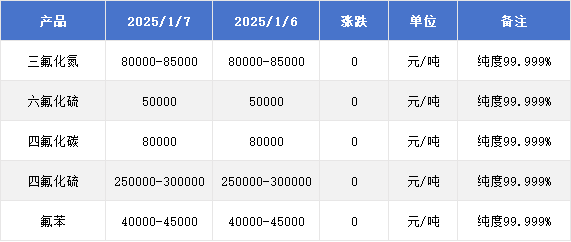 1月7日含氟电子气体市场价格动态