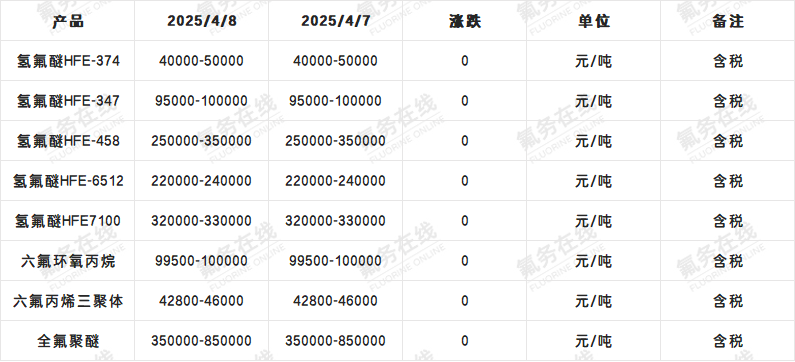 【含氟电子氟化液】4月8日市场价格动态