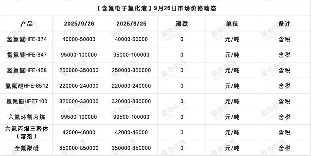 【含氟电子氟化液】9月26日市场价格动态