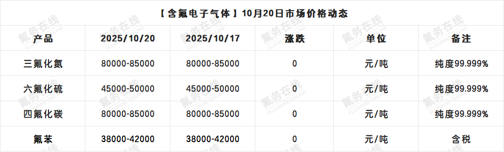 【含氟电子气体】10月20日市场价格动态