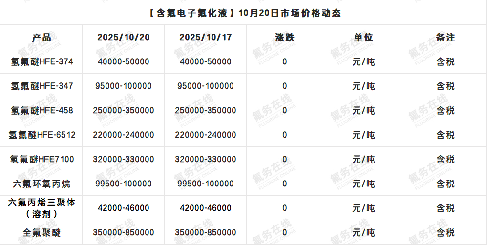 【含氟电子氟化液】10月20日市场价格动态