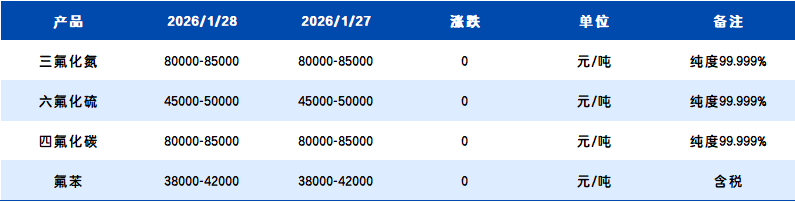 【含氟电子气体】1月28日市场价格动态