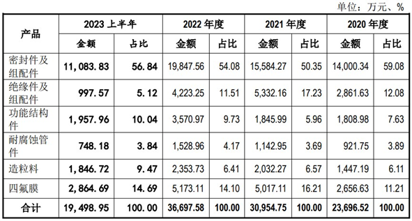 招股书披露,肯特股份专注于高性能工程塑料制品及组配件的研发、生产和销售,主营业务未发生重大变化。公司主要产品包括密封件及组配件、绝缘件及组配件、功能结构件、耐腐蚀管件、造粒料和四氟膜六大类。公司产品具有耐高压、耐高低温、耐腐蚀、耐磨损、抗蠕变、低介电损耗、高阻抗等优异性能,终端产品可广泛应用于阀门和压缩机等通用机械制造、通信设备制造、高铁及轨道交通设备制造、汽车制造、仪器仪表制造、医疗器械、半导体设备、环保设备、风电设备等领域。