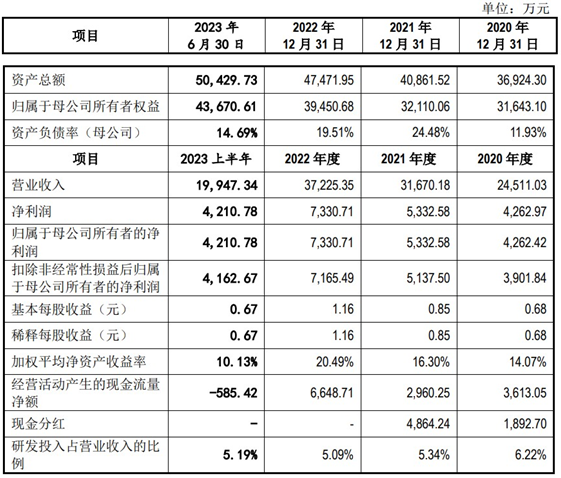 财务方面,于2020年度、2021年度、2022年度及2023上半年度,实现营业收入分别约为2.45亿元、3.17亿元、3.72亿元、1.99亿元。净利润分别约为4262.97万元、5332.58万元、7330.71万元、4210.78万元。
