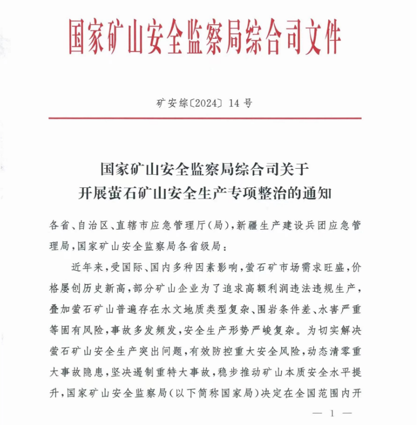 近年来,受国际、国内多种因素影响,萤石矿市场需求旺盛,价格屡创历史新高,部分矿山企业为了追求高额利润违法违规生产,叠加萤石矿山普遍存在水文地质类型复杂、围岩条件差、水害严重等固有风险,事故多发频发,安全生产形势严峻复杂。为切实解决萤石矿山安全生产突出问题,有效防控重大安全风险,动态清零重大事故隐患,坚决遏制重特大事故,稳步推动矿山本质安全水平提升,国家矿山安全监察局(以下简称国家局)决定在全国范围内开展萤石矿山安全生产专项整治。现将有关事项通知如下: