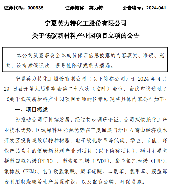 4月30日,英力特发布关于低碳新材料产业园项目立项的公告。