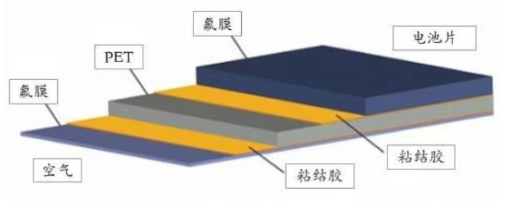 典型的背板膜结构如图所示,最外层为耐候性很好的氟树脂,具备良好的抗腐蚀能力,能阻隔水汽,抗紫外线老化,中间为PET聚酯薄膜,绝缘性能良好并保障力学强度,外层氟膜和PET之间通过粘合胶粘结,内层薄膜与EVA粘结后衔接到电池晶片上。