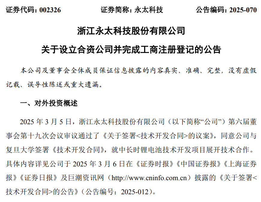 推进中长时锂电池技术产业化,永太科技成立合资公司!
