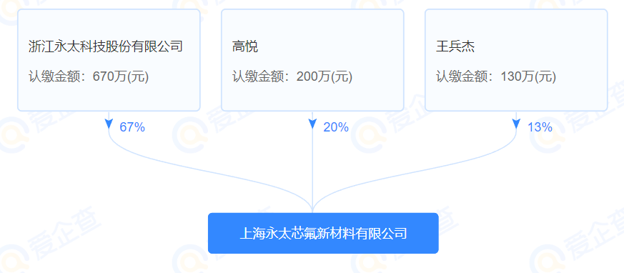 公告显示,永太芯氟注册资本为人民币1000万元,其中永太科技出资670万元,持股比例67%;高悦出资200万元,持股比例20%;王兵杰出资130万元,持股比例13%。