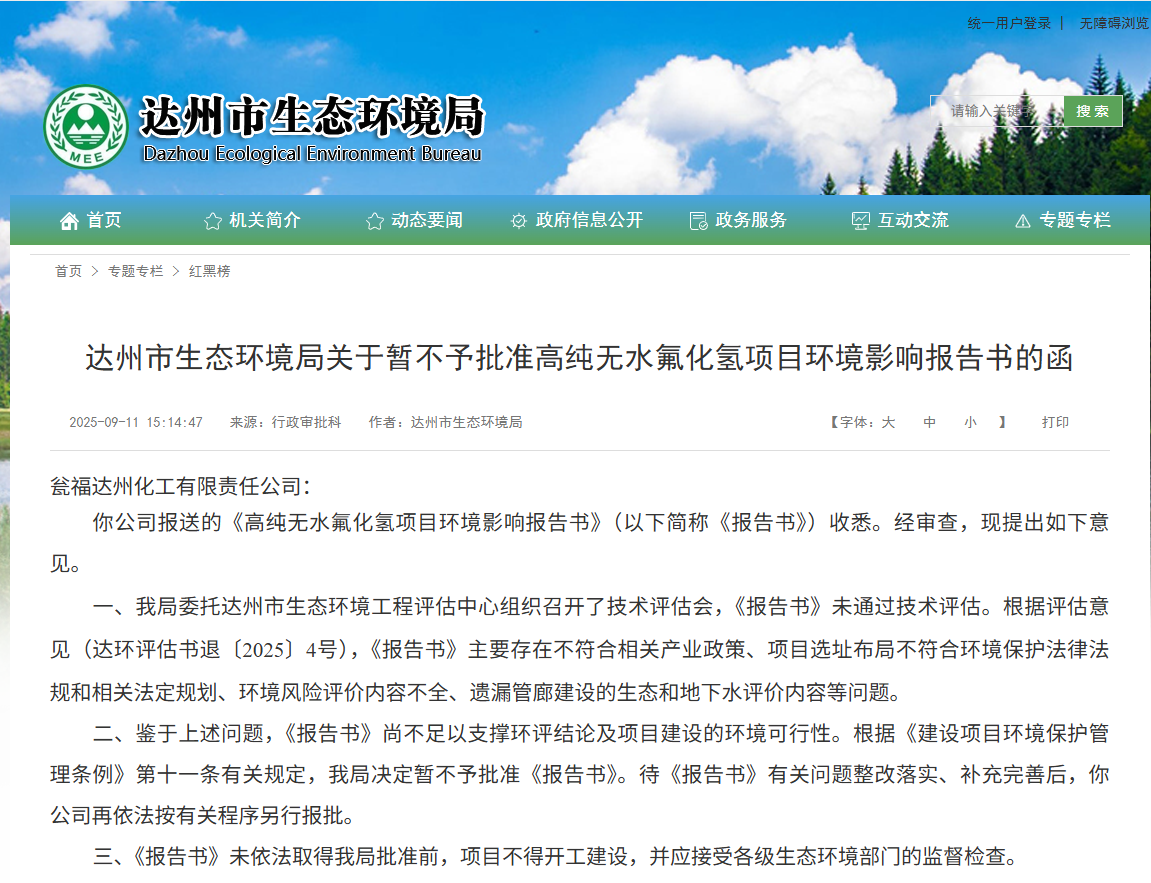 近日达州市生态环境局针对瓮福达州化工有限责任公司《高纯无水氟化氢项目环境影响报告书》(以下简称《报告书》)做出暂不予批准指示。