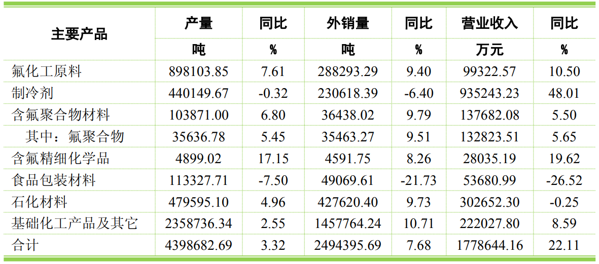 1、与上年同期比较,报告期,公司主要产品的产量、外销量、营业收入稳健增长。其中:制冷剂产量、外销量略有下降,但因产品价格涨幅较大导致营业收入增幅较大;食品包装材料因市场需求较弱,产量下降,产品价格和营业收入降幅较大;石化材料虽产销量保持增长,但因产品价格下跌,导致营业收入下降。
