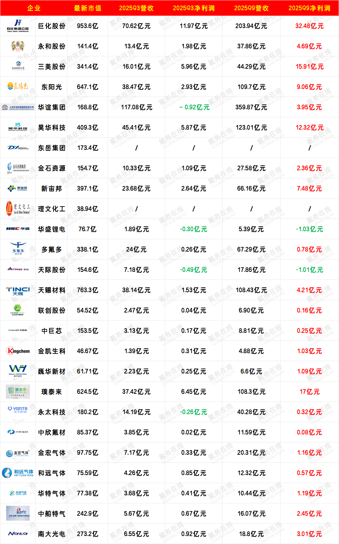 据统计,氟化工领域26家上市公司第三季度业绩延续强劲增长,营收与净利润实现双升,行业高景气度持续兑现。