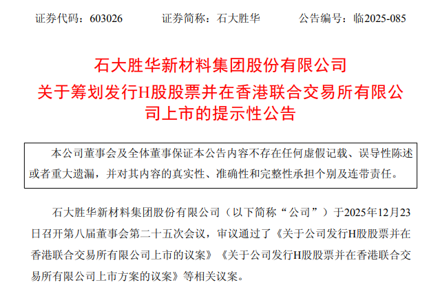 12月23日,石大胜华发布公告称,公司当日召开董事会,审议通过了关于发行H股股票并在香港联合交易所有限公司主板挂牌上市的议案。根据公告,石大胜华拟申请首次公开发行境外上市外资股(H股),目的是深入推进全球化战略布局,打造国际化资本运作平台,提高综合竞争力。