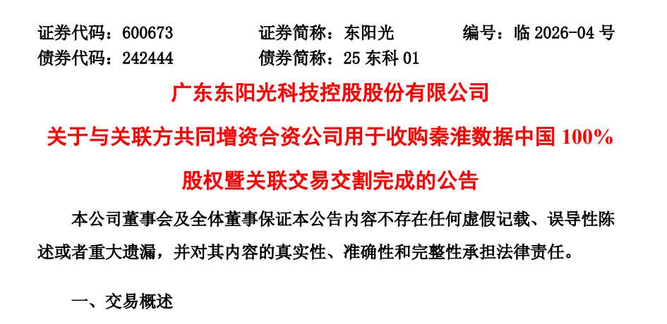 1月16日晚间,东阳光发布公告,宣布与控股股东共同增资合资公司,并已完成对秦淮数据中国100%股权的收购交割。本次交易总金额达280亿元,东阳光已出资34.5亿元。