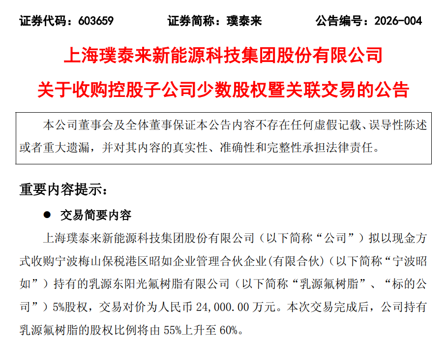 1月27日晚间,璞泰来发布公告称,公司拟以现金2.4亿元收购关联方宁波梅山保税港区昭如企业管理合伙企业(有限合伙)持有的乳源东阳光氟树脂有限公司(以下简称“乳源氟树脂”“标的公司”)5%股权。交易完成后,公司对乳源氟树脂的持股比例将由55%上升至60%。此次收购将提升归属于公司股东的净利润规模,按交易对方承诺的业绩目标,未来三年每年可增加2500万元至3000万元,有助于增强公司整体盈利。