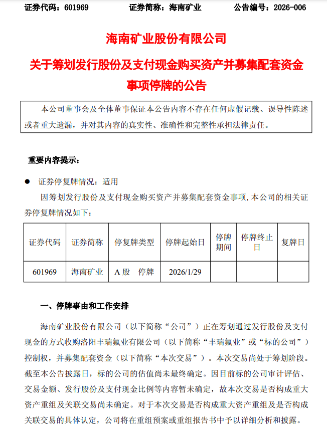 1月28日晚间,海南矿业公告,筹划通过发行股份及支付现金的方式收购洛阳丰瑞氟业控制权,并募集配套资金。