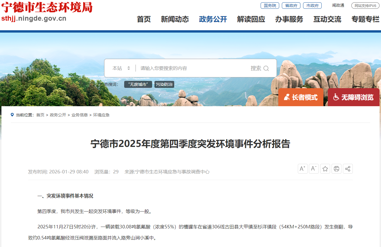 福建宁德市政府官网2026年1月29日公布的《宁德市2025年度第四季度突发环境事件分析报告》披露了一起突发环境事件,等级为一般。事发四天后的2025年11月30日,下游水体恢复正常;12月2日,监测结果表明事故点及下游水体水环境质量恢复至原有水平,应急指挥部终止应急响应。
