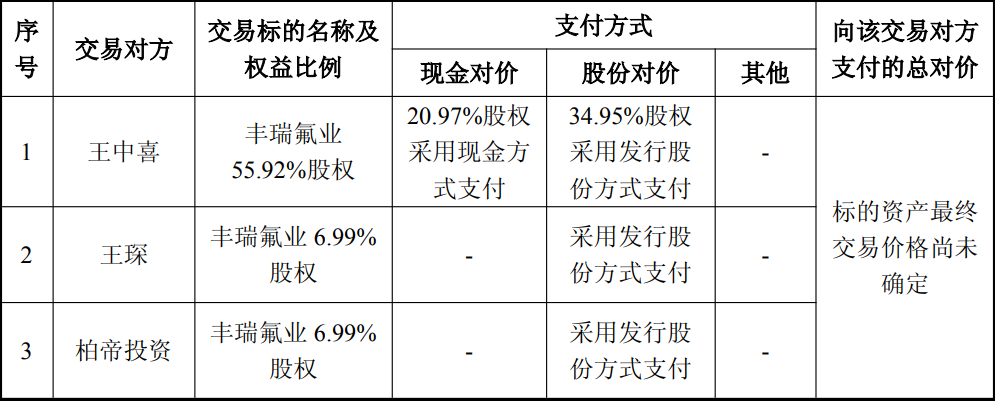 具体来看,王中喜持有丰瑞氟业20.97%股权采用现金方式支付,34.95%股权采用发行股份方式支付,王琛、柏帝投资持有的丰瑞氟业股权也是通过发行股份方式支付。