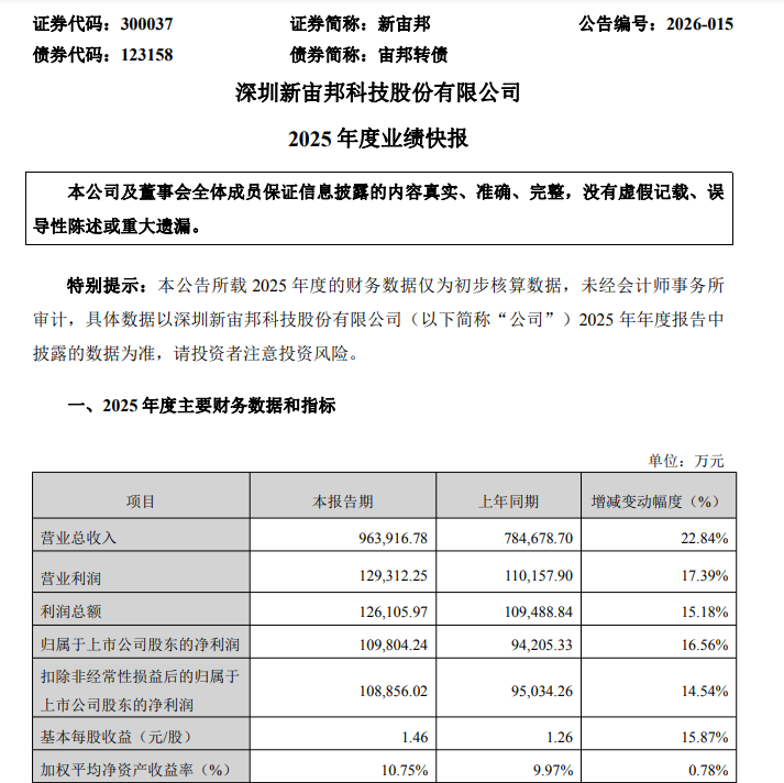 2月10日晚间,电解液头部厂商新宙邦发布业绩快报,2025年营收净利均实现稳健增长,其中营收为96.39亿元,同比增长22.84%;净利润10.98亿元,同比增长16.56%。