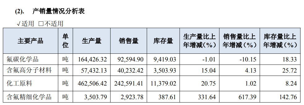 公告指出,2025年公司氟碳化学品产量为16.44万吨,同比减少1.01%;实现营业收入27.72亿元,同比增长13.31%。含氟高分子材料产量为5.74万吨,同比增长15.04%;实现营业收入17.38亿元,同比增长9.93%。二者合计贡献45.11亿元,占总营收86.64%。