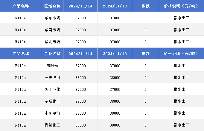 2024年11月14日国内R410a价格一览表