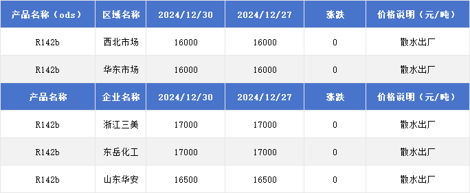 2024年12月30日国内R142b价格一览表
