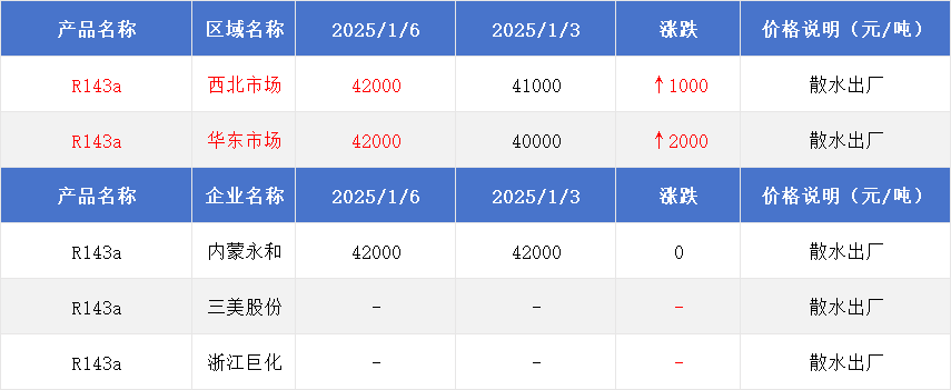 2024年1月6日国内R143a价格一览表
