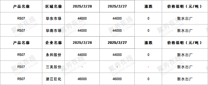 2024年2月28日国内R507价格一览表
