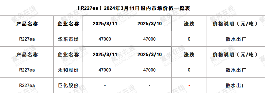 【R227ea】2024年3月11日国内市场价格一览表