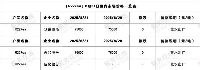 【R227ea】8月21日国内市场价格一览表