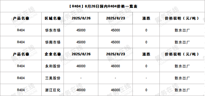 【R404】8月26日国内R404价格一览表