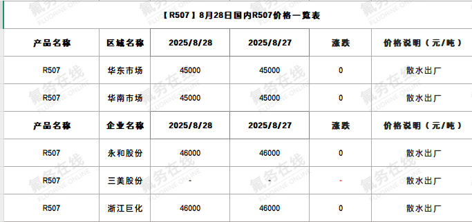 【R507】8月28日国内R507价格一览表