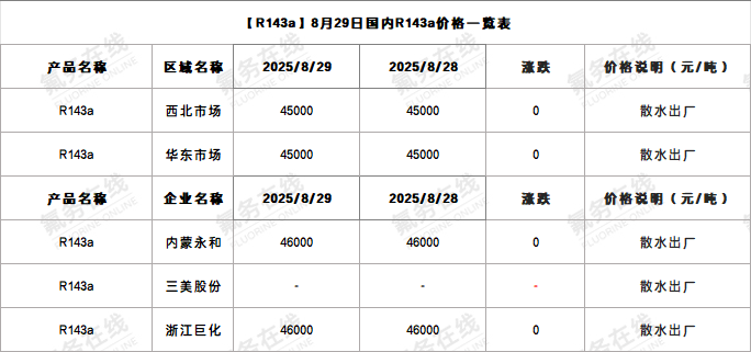 【R143a】8月29日国内R143a价格一览表