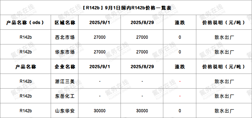 【R142b】9月1日国内R142b价格一览表