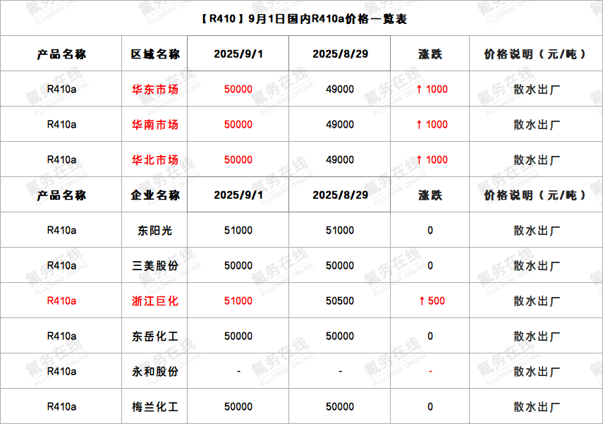 【R410】9月1日国内R410a价格一览表