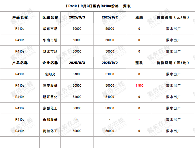 【R410】9月3日国内R410a价格一览表