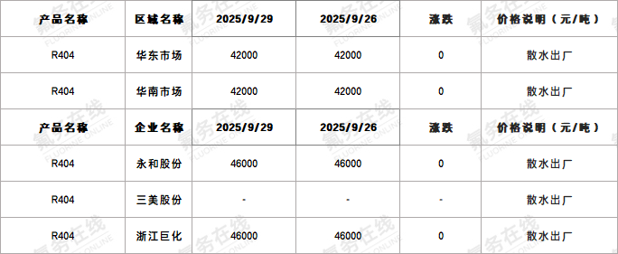 【R404】9月29日国内R404价格一览表