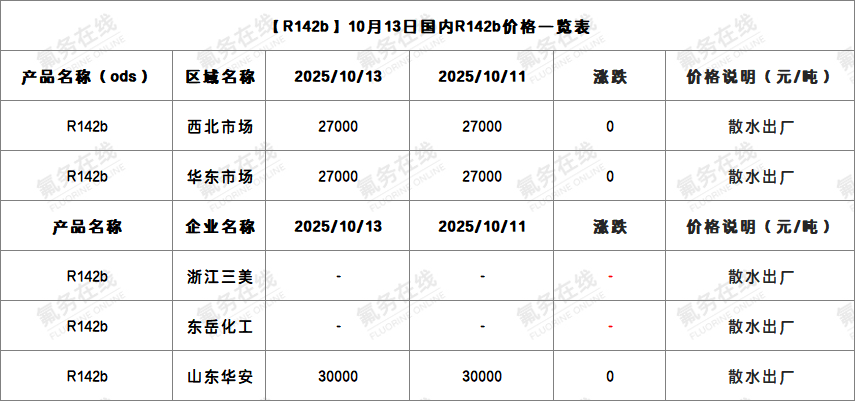【R142b】10月13日国内R142b价格一览表