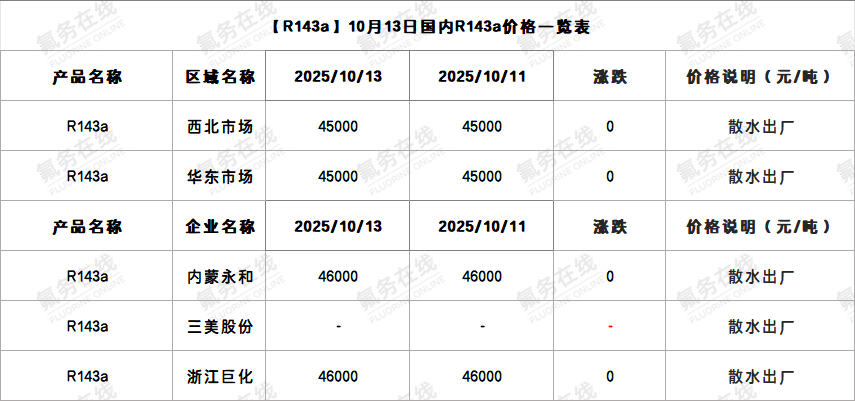 【R143a】10月13日国内R143a价格一览表