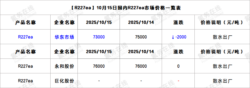 【R227ea】10月15日国内R227ea市场价格一览表