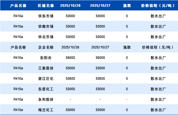 【R410】10月28日国内R410a价格一览表