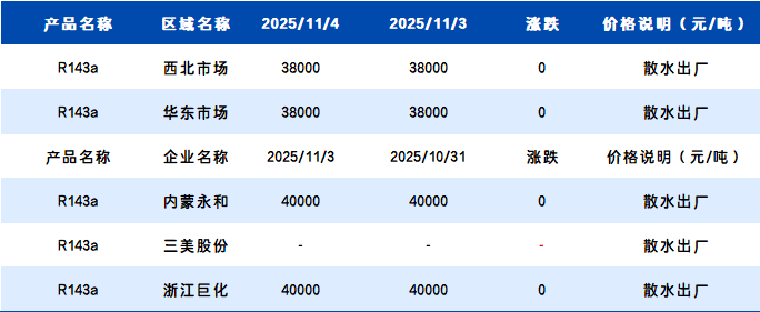 【R143a】11月4日国内R143a价格一览表