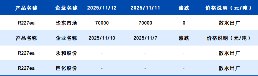 【R227ea】11月12日国内R227ea市场价格一览表