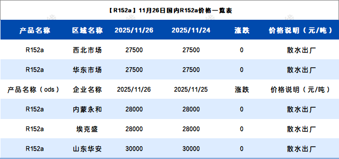 【R152a】11月26日国内R152a价格一览表