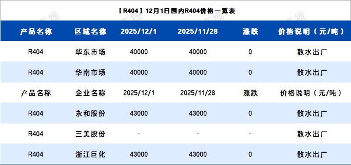 【R404】12月1日国内R404价格一览表