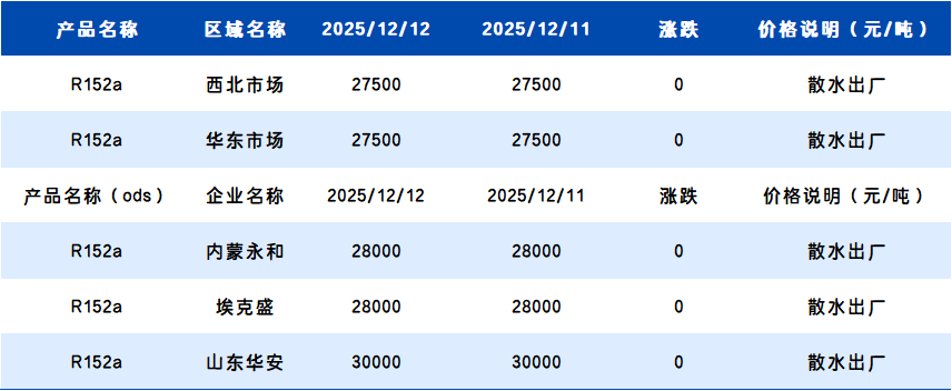 【R152a】12月12日国内R152a价格一览表