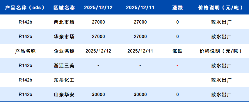 【R142b】12月12日国内R142b价格一览表