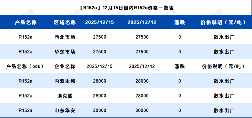 【R152a】12月15日国内R152a价格一览表